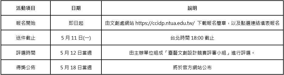 (二) 報名方式採取網路報名:參賽者請至文創處網站 https://ccidp.ntua.edu.tw/ 點選連結填寫報名資料,並上傳作品檔案。